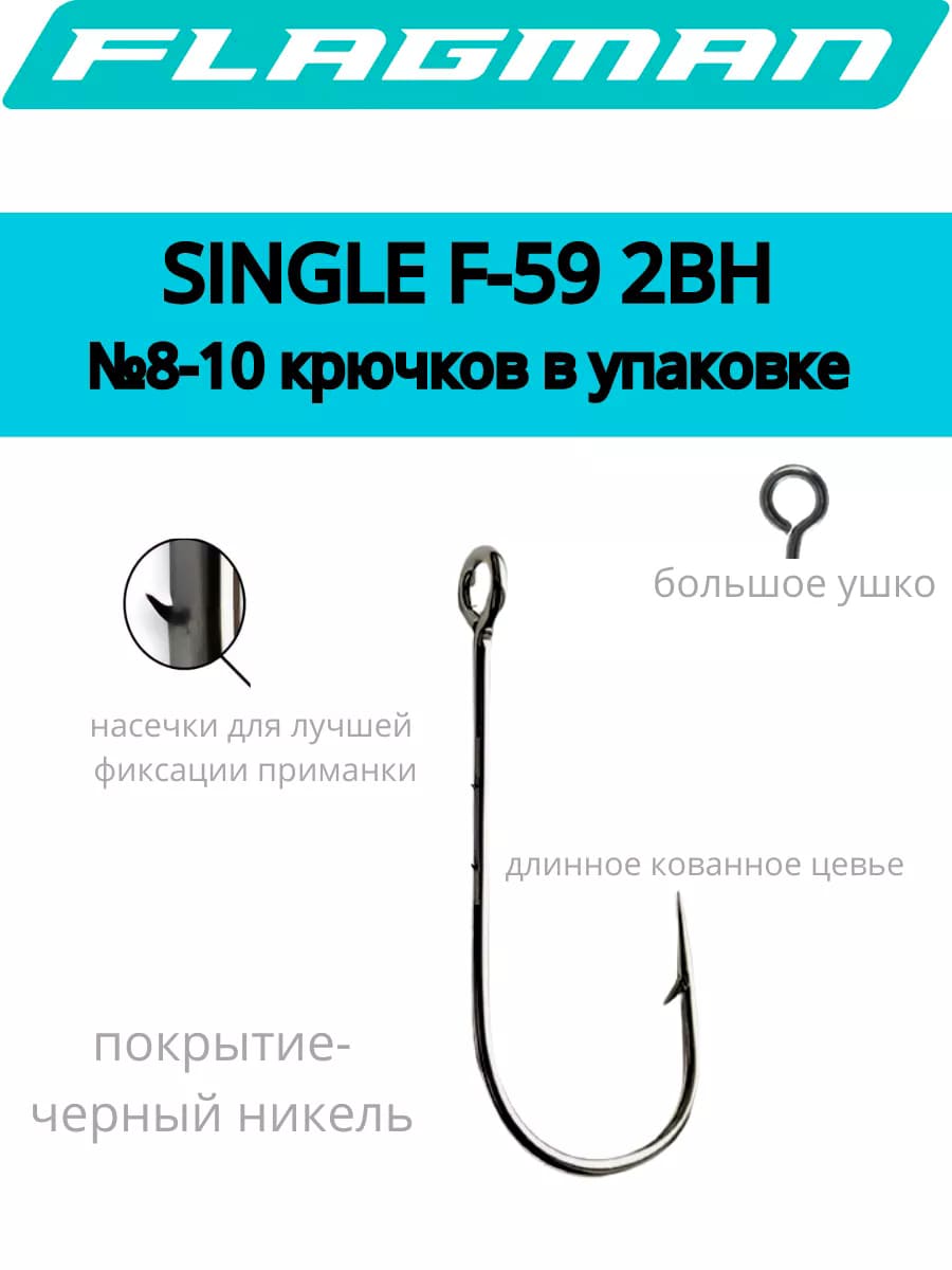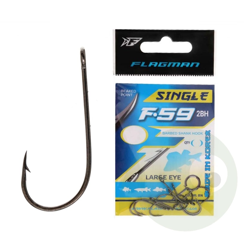 Az ukrán Flagman cég F-59-2BH horga szívós, rugalmas acélból készül. Nagy, kerek szemében szabadon mozog a cheburashka, az összes rig-típus, a kapocs egyaránt. Szárán mikroszakállak akadályozzák meg a műcsali lecsúszását. Korróziógátló fekete nikkel bevonat védi a külső hatásoktól. Koreában készül.