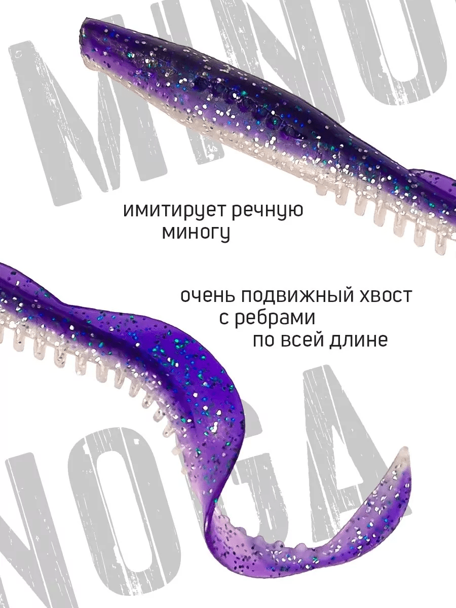 A Siberian Shaman Minoga szilikon csalija egyedülálló a maga nemében. Ingólát formáz, rendkívül élethű módon. Szemei ragasztott gyöngyök, teste fogazott, elnyújtott. Teste és twister-farka kígyózó mozgásának a legtöbb ragadozó nem tud ellenállni. Kiváló csali csukára, harcsára. Nagyon szívós, ellenálló gumiból készül.