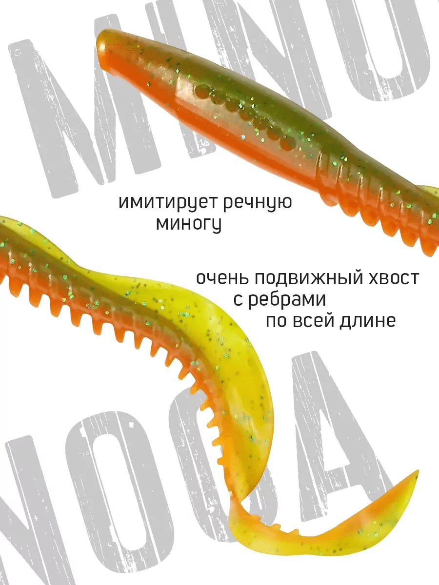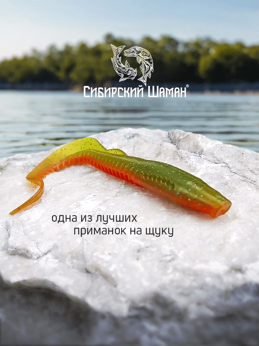 A Siberian Shaman Minoga szilikon csalija egyedülálló a maga nemében. Ingólát formáz, rendkívül élethű módon. Szemei ragasztott gyöngyök, teste fogazott, elnyújtott. Teste és twister-farka kígyózó mozgásának a legtöbb ragadozó nem tud ellenállni. Kiváló csali csukára, harcsára. Nagyon szívós, ellenálló gumiból készül.